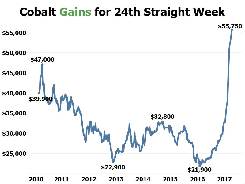 Dear Reader, As CNBC reported last week we are seeing an unprecedented rise in the price of this rare blue metal that is absolutely essential to the Electric car and battery revolutions. China is buying up all available supply and manufacturers of EV’s such as Tesla are becoming very nervous. The below article looks at this incredible boom and possible ways for investors to play it: