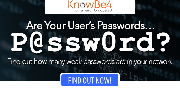 | | | | | | | Hi Rupert, Are your user's passwords…P@ssw0rd? Verizon's recent Data Breach Report showed that 81% of hacking-related breaches used either stolen and/or weak passwords. Employees are the weakest link in network security, using weak passwords and falling for phishing and social engineering attacks. KnowBe4's complimentary Weak Password Test checks your Active Directory for 10 different types of weak password related threats and reports any fails so that you can take action. Here's how the Weak Password Test works: - Reports on the accounts that are affected